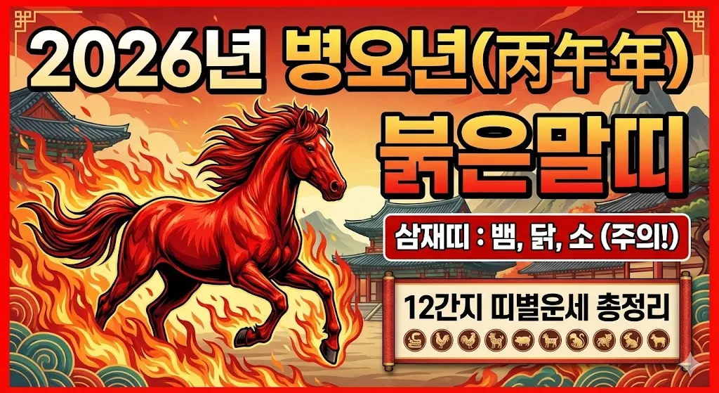 2026년 무슨해인지 궁금하신 분들이 많습니다. 2026년은 병오년(丙午年)으로 붉은 말의 해입니다. 말띠가 주인공이 되는 해로, 활력과 변화가 강조되는 시기인데요. 이 글에서는 2026년 띠, 삼재띠, 띠별운세까지 상세히 정리했습니다.